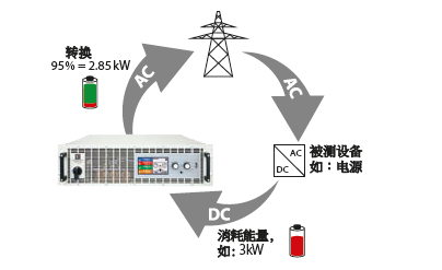 本負載最主要的特點是其AC輸入端,即電網連接端,也可用作直流電返回的輸出端,轉換效率接近93%。這種能量轉換方式有助于降低用電成本,且避免使用昂貴的制冷系統,因為普通電子負載使用過程中會將直流輸入電量轉化成熱量,從而需要制冷系統進行冷卻。下面為其原理示意圖: