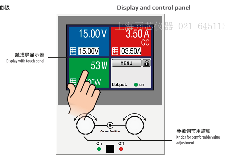 設定與實際輸出電壓、電流與功率都清晰顯示于圖形顯示器上。彩色的TFT屏幕為點觸式,用一個手指就能控制所有功能。通過旋鈕或者數字鍵盤直接輸入參數,也可調節設定電壓、電流或功率。若想防止意外操作,可鎖定所有操作鍵。